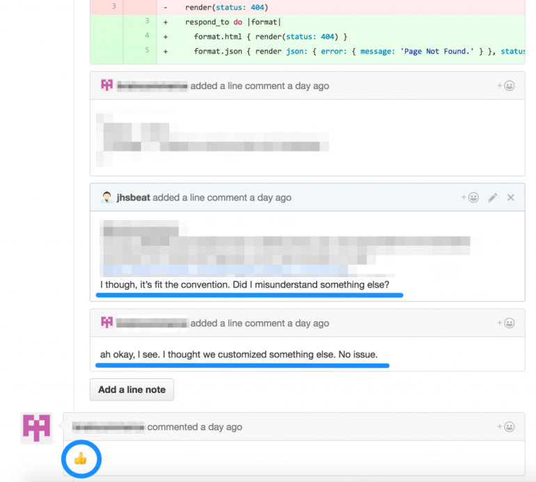 일반적으로 온라인 코드리뷰는 코드의 작성자가 변경사항에 대한 코드리뷰를 요청하고, 리뷰어들은 해당 코드의 피드백을 작성하는 방식으로 진행됩니다. 만약, 코드 수정이 필요하다면 코드 작성자는 수정 사항들을 반영합니다. 이 과정이 완료되면 리뷰어들은 코드의 최종 확인을 완료합니다. 아래의 그림은 github을 이용하여 온라인에서 진행하는 코드리뷰의 예시입니다. 버전 관리 시스템의 특성에 따라 조금씩 다르지만 github의 경우 리뷰어가 해당 코드를 머지(merge)할 수 있는 권한이 있다면 최종 확인 후 코드를 머지하거나, 해당 코드가 최종적으로 확인되었음을 메시지로 표시합니다. 아래의 그림에서는 엄지손가락(thumbsup) 이모티콘을 이용해서 최종 확인 완료를 표시하였습니다.