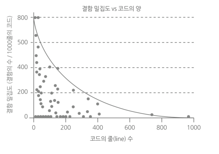 실제로 코드리뷰를 수행하다 보면 수천 줄의 수정사항을 확인해야 하는 경우가 있습니다. 한 번에 확인해야 하는 코드의 양이 너무 많은 경우 리뷰어는 상세한 리뷰를 진행하기 위해서 한 번에 너무 많은 시간을 투자해야만 합니다. 대부분 리뷰어는 코드의 양에 따라서 리뷰의 깊이를 조절하게 됩니다. 아래의 그림은 코드의 양(LOC: Line of Code)과 결함의 밀집도의 상관 관계를 나타내는 그림입니다. 그림에서도 볼 수 있듯이 한 번에 확인해야 하는 코드의 양이 많아지게 되면 발견되는 버그나 개선사항의 밀집도가 낮아져서 결과적으로 많은 부분을 놓치고 지나가게 됩니다. 이러한 이유로 많은 사람은 한 번에 리뷰 받는 코드의 양을 500줄 이하로 유지하라고 권장합니다.
