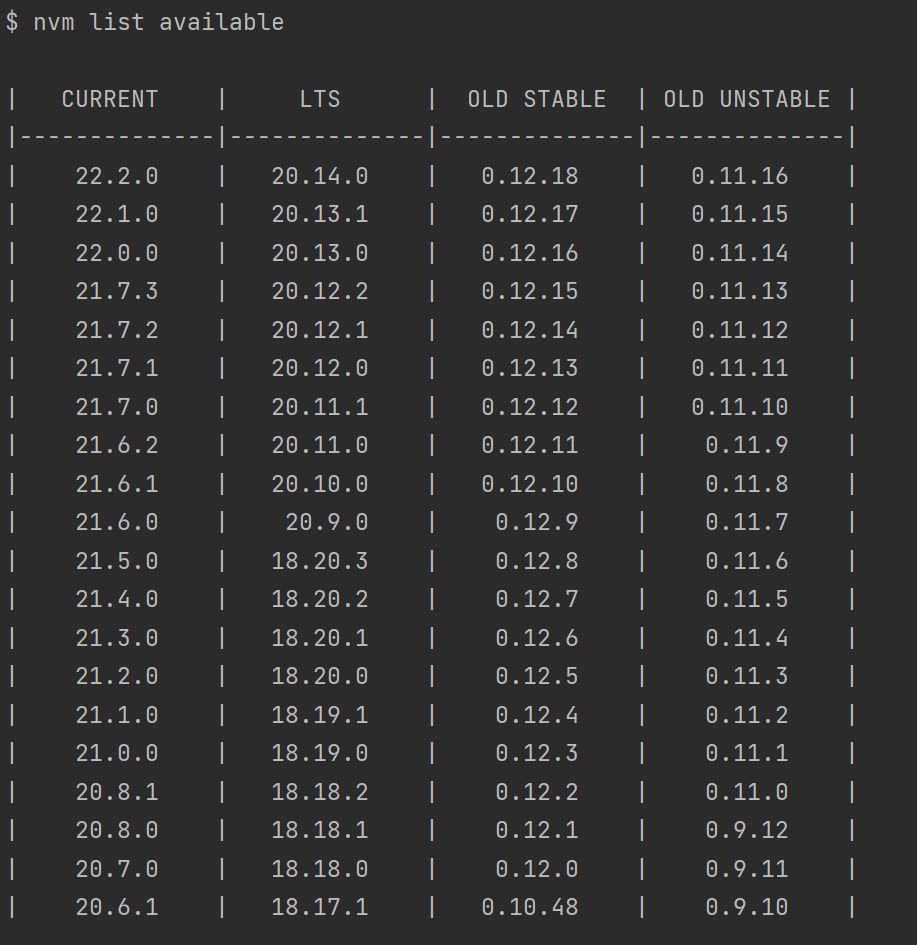 # 설치할 수 있는 모든 Node 버전 조회 (재미삼아 해보지마세요 겁나많음... 황급히 control C 두드리기)