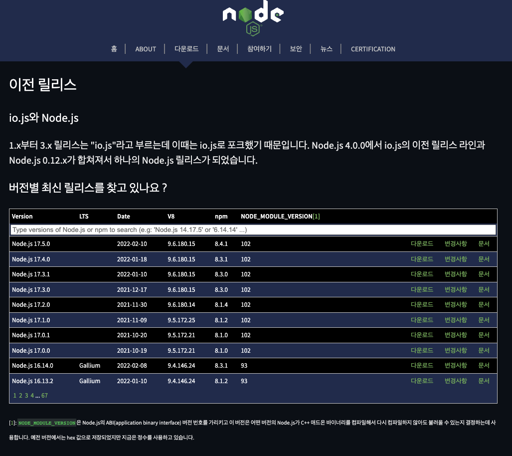 일단 현재 설치 할 수 있는 Node버전 리스트를 확인해보자. 아래 링크로 이동해보자.
